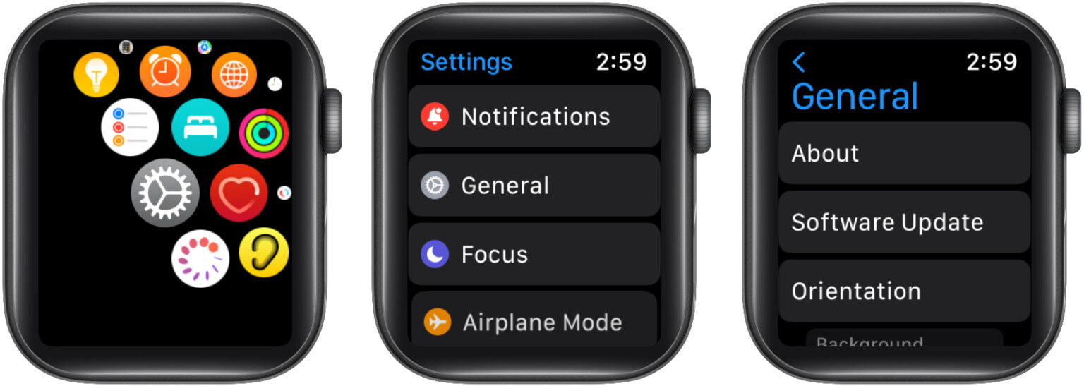 - در اپل واچ خود به Settings بروید و روی General ضربه بزنید.