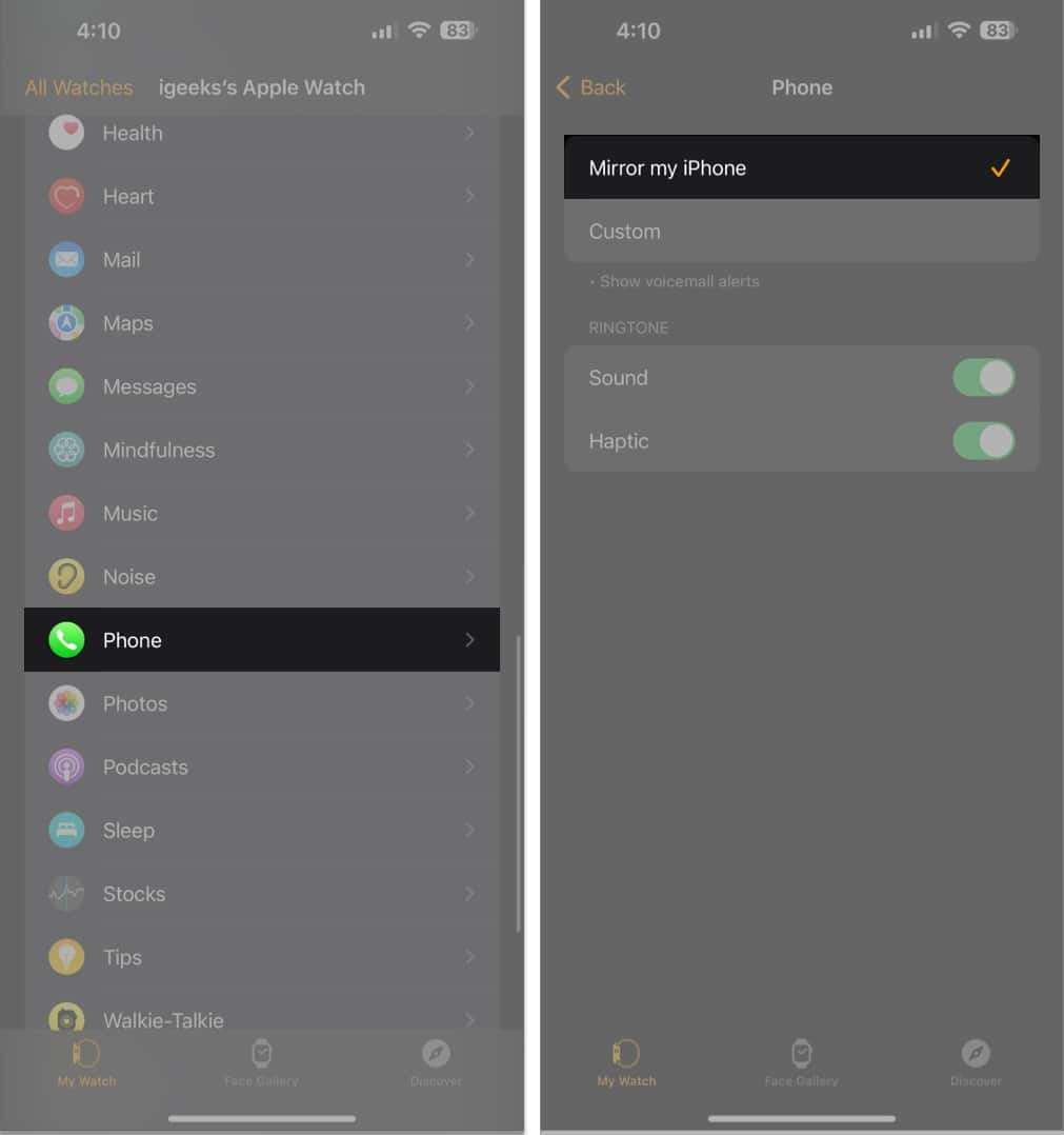 اگر Mirror my iPhone در برنامه Watch بهطور پیشفرض انتخاب شده باشد، آنرا تغییر ندهید. با اینحال، بررسی کنید که تنظیمات ویبره در آیفون درست باشد. برای اینکار مراحل زیر را دنبال کنید: