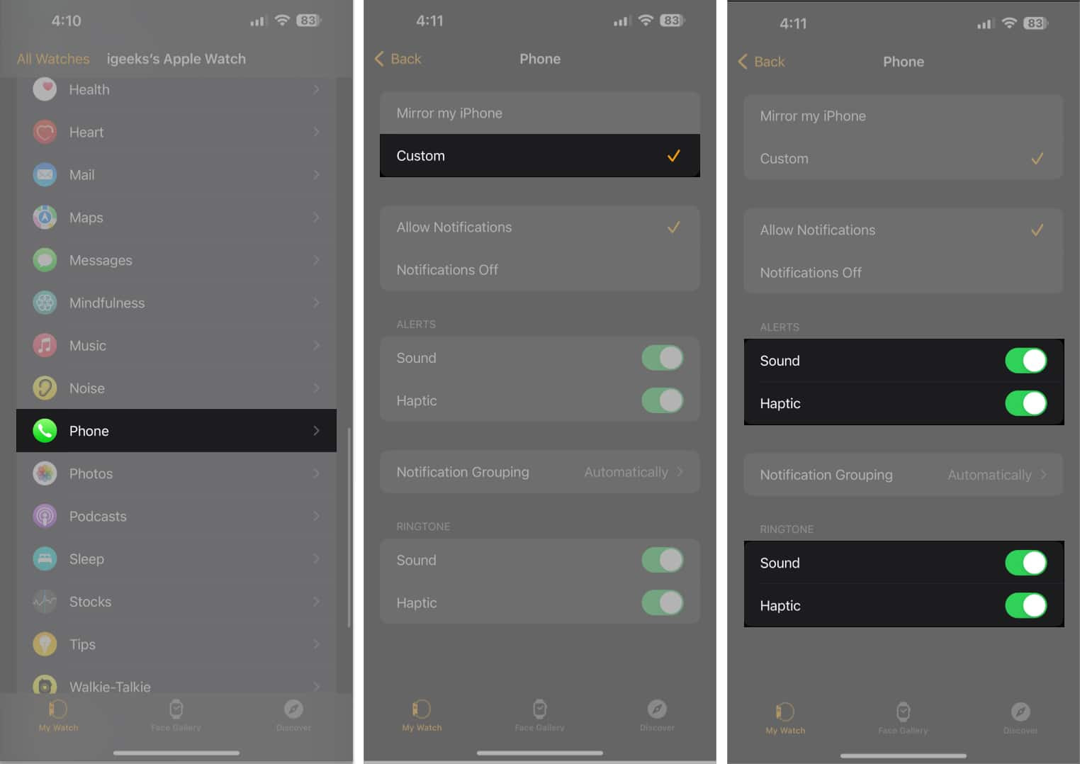 حال اگر میخواهید برای برنامههای مختلف اپل واچ تنظیمات ویبره را تغییر دهید، گزینه Custom را انتخاب کنید. بر اساس برنامه تنظیمات مختلف Haptics از شما خواسته میشود. در اینجا برنامه Phone مد نظر ماست. حال یک ریاستارت سریع انجام دهید و از این به بعد اپل واچ تنها برای برنامه مورد نظر شما ویبره میشود.
