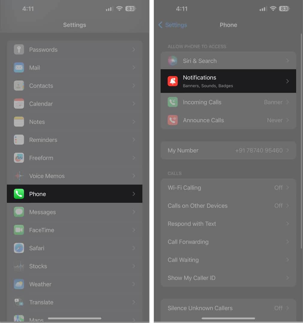 - به پایین بروید و برنامه Phone یا برنامه مورد نظر را انتخاب کنید. Notifications را انتخاب کنید.