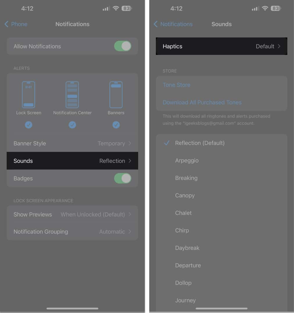 - روی Sounds ضربه بزنید. مطمئن شوید که Haptics روی Default تنظیم شده باشد.