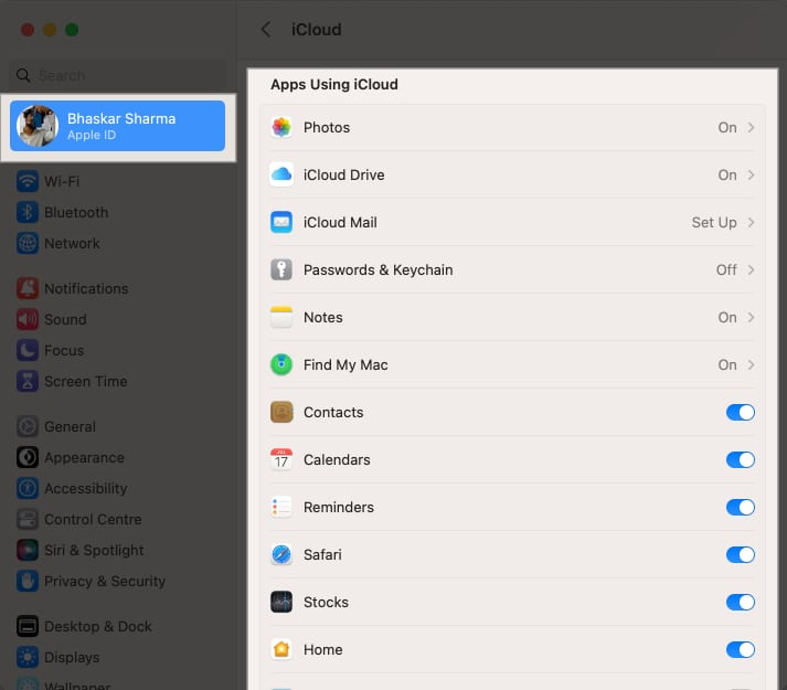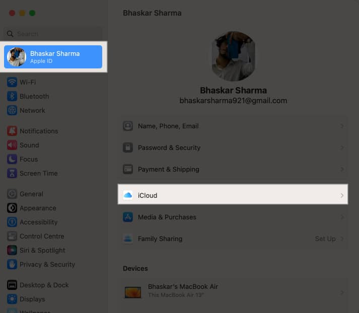 - به Apple ID خود بروید و روی iCloud کلیک کنید.