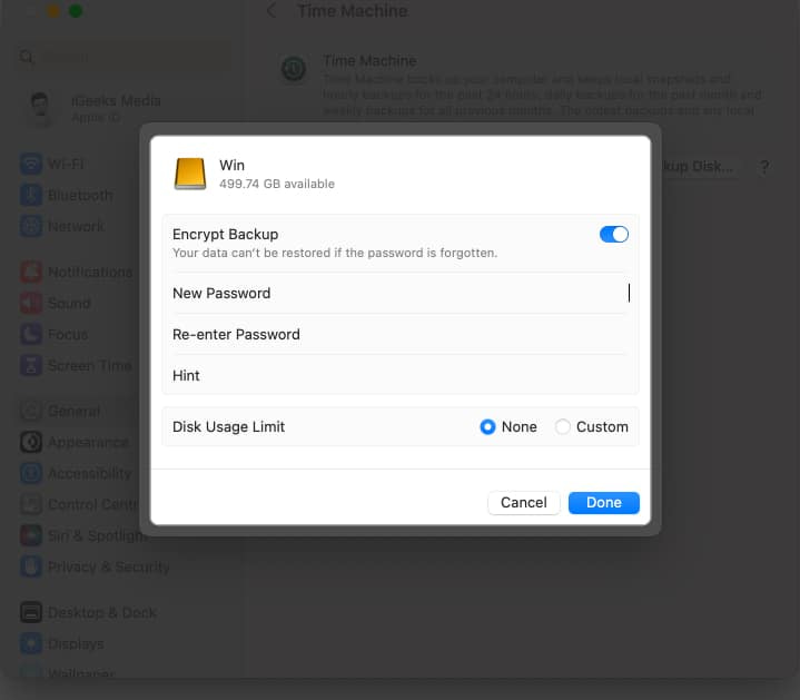 - یک رمز عبور برای محافظت از نسخه پشتیبان خود تهیه کنید. یک Disk Usage Limit انتخاب کرده و بر روی Done ضربه بزنید.