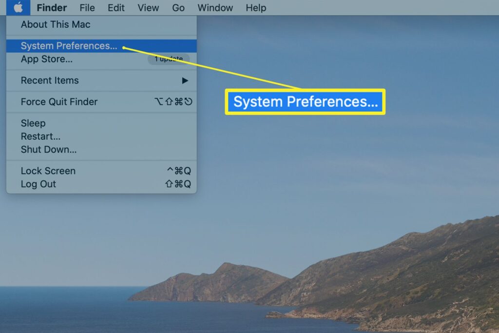 - ابتدا روی لوگوی اپل در گوشه سمت چپ بالای صفحه اصلی سیستم عامل کلیک کنید و گزینه System Preferences را انتخاب کنید