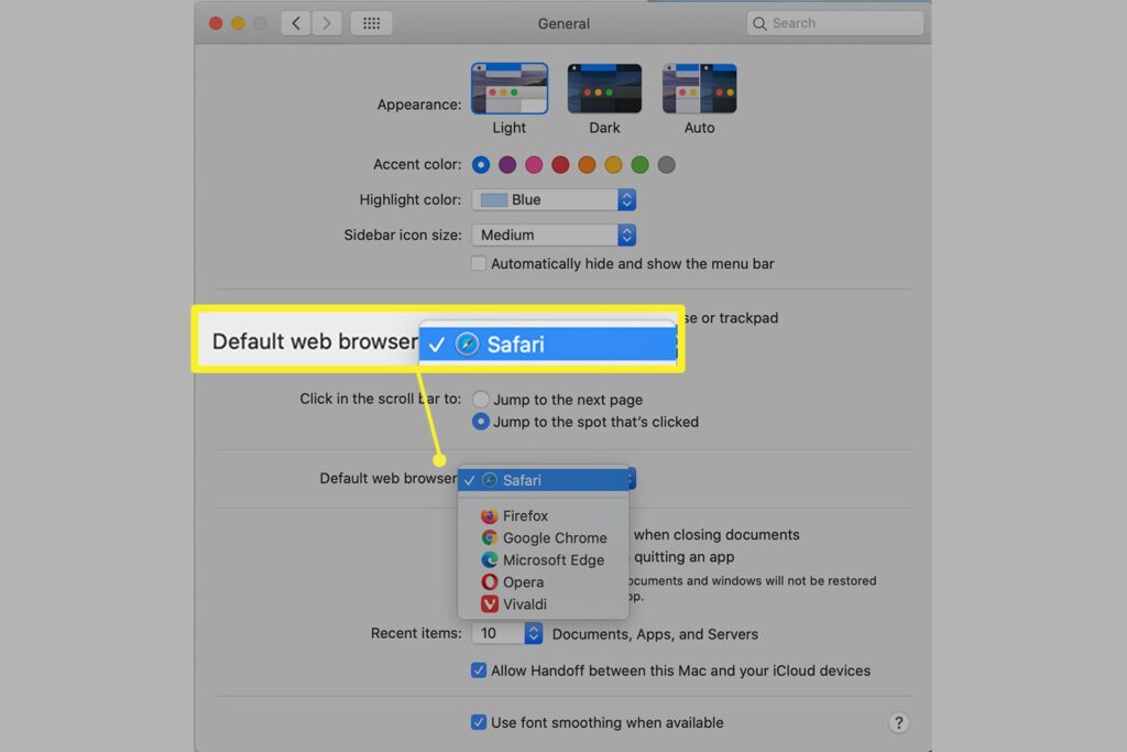 - حالا روی منویی که در کنار عبارت Default Web Browser قرار دارد کلیک کنید تا لیست تمام مرورگرهایی که روی سیستم عامل شما نصب شده است، باز شود. حتما به این موضوع توجه داشته باشید که اگر میخواهید از یک مرورگر اینترنتی به عنوان نرم افزار پیش فرض در مک استفاده کنید، حتما لازم است که پیش از انجام این آموزش، آن را دانلود کرده و بر روی مک بوک یا آی مک خود نصب کرده باشید