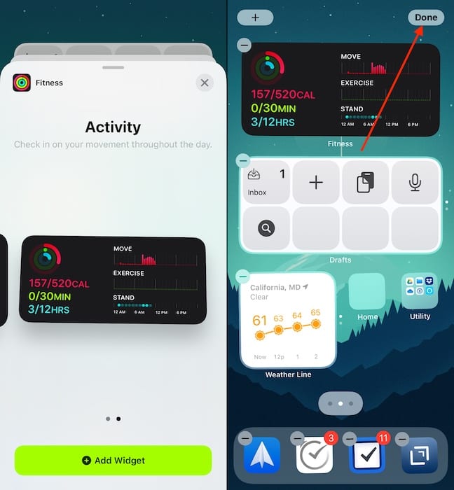 6. سپس روی دکمه‌ی Add Widget در پایین صفحه کلیک کنید و در نهایت از گوشه بالا سمت راست صفحه گزینه‌ی Done را بفشارید.