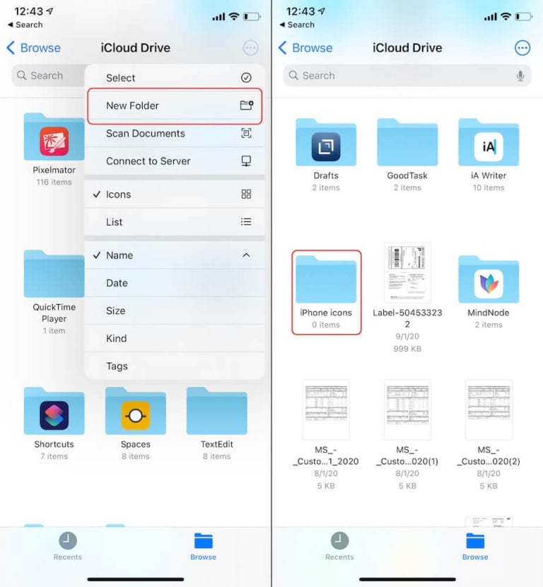 پس از اینکه فایل‌های مد نظر خود را دانلود کردید٬ مطمئن شوید که آن‌ها به خوبی در آیفون شما مورد استفاده قرار می‌گیرند. ما توصیه می‌کنیم از اپلیکیشن Files آیفون خود استفاده کنید و یک پوشه به نام iPhones Icons برای دسترسی آسان به آیکون‌هایی که دانلود می‌کنید را ایجاد کنید. اگر از پک‌های مختلفی استفاده می‌کنید٬ این راه سودمندی برای نظم بخشیدن به آیکون‌های شما است.