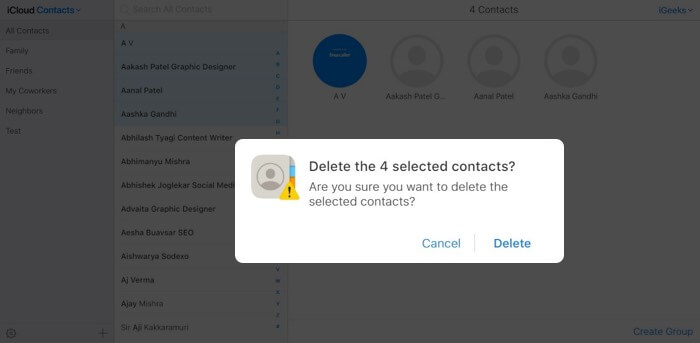 3. Delete contacts را بزنید تا فرمان حذف نهایی شود؛