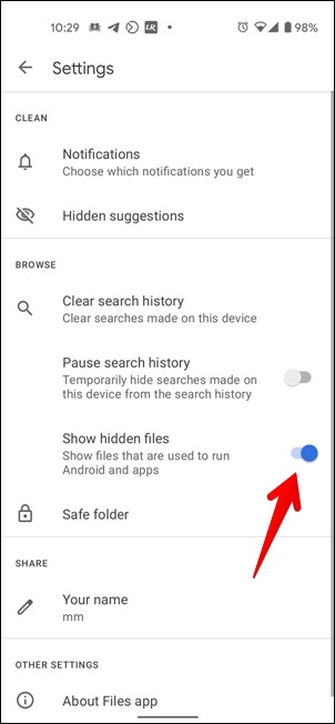 - ضامن کنار Show hidden files را فعال کنید. اگر از برنامهی File explorer دیگری استفاده میکنید به دنبال گزینهی مشابهی بگردید که فایلهای مخفی را نشان دهد.