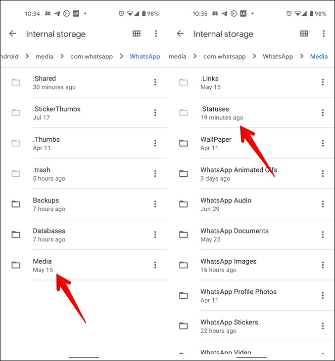 - پوشهی Media را لمس کرده و به پوشهی Statuses بروید. متوجه خواهید شد که رنگ پوشهی Statuses متفاوت است زیرا که یک پوشهی مخفی است.