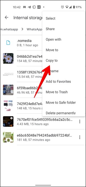 برای این کار نماد سه نقطه در کنار عکس یا فیلم را لمس کنید. سپس Copy to را انتخاب کنید. یک پوشه خارج از واتساپ انتخاب کرده و در آن جا paste کنید. به طور مشابه همین مراحل را برای سایر فایلهایی که میخواهید انجام دهید. پس از کپی، عکس و یا فیلمها در فایل گالری گوشی شما قابل مشاهده خواهد بود.
