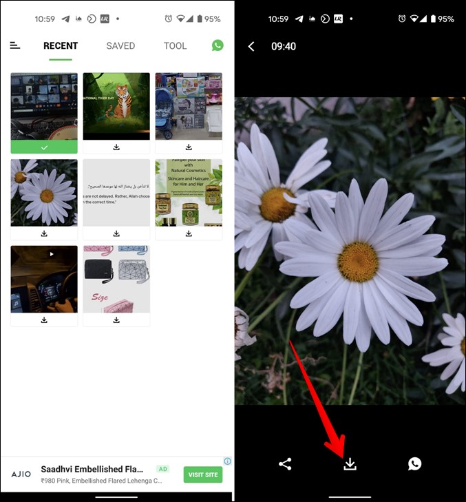 - حال برنامهی Status saver را باز کنید. استوریهای اخیره مشاهده شده را خواهید دید. عکس یا ویدئویی که میخواهید در گالریتان ذخیره کنید را انتخاب و نماد بارگیری را انتخاب کنید. حال عکس یا ویدئوی مورد نظر در گالری شما ذخیره خواهد شد.