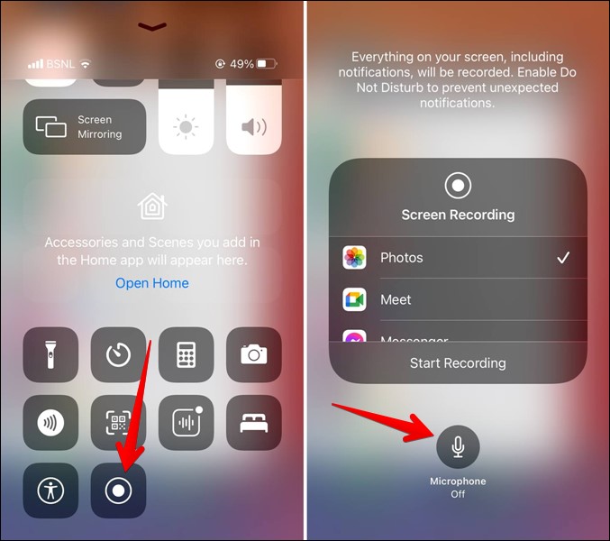 برای این کار در آیفون کنترل سنتر را باز کرده و گزینهی Screen Recording را جستجو کنید. به نظر میرسد به شکل یک دایره با یک نقطه در داخلش است. گزینهی Screen Recording را انتخاب و روی نماد میکروفون را لمس کنید. این کار برای این است که صدا نیز همراه با تصویر ضبط شود.