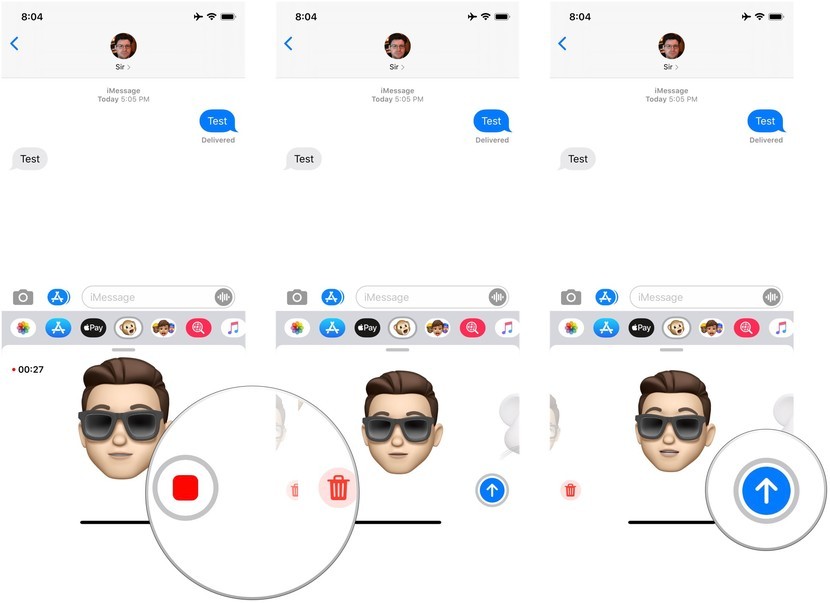 - حالا در صورتی که میخواهید پیام را حذف کنید، روی آیکون سطل زباله تپ کنید و اگر میخواهید آن را برای مخاطب خود ارسال کنید، روی فلش سفید رنگ که در گوشه سمت راست پایین صفحه دیده میشود، تپ کنید. با انجام این کار انیموجی و یا میموجی مورد نظر شما به همراه پیام صوتی هماهنگ با حرکات چهره در اختیار کاربر مورد نظر قرار میگیرد. همچنین لازم است بدانید که شما میتوانید این انیمیشنها را در دیگر شبکه های اجتماعی و اپلیکیشن ها نیز به اشتراک بگذارید.