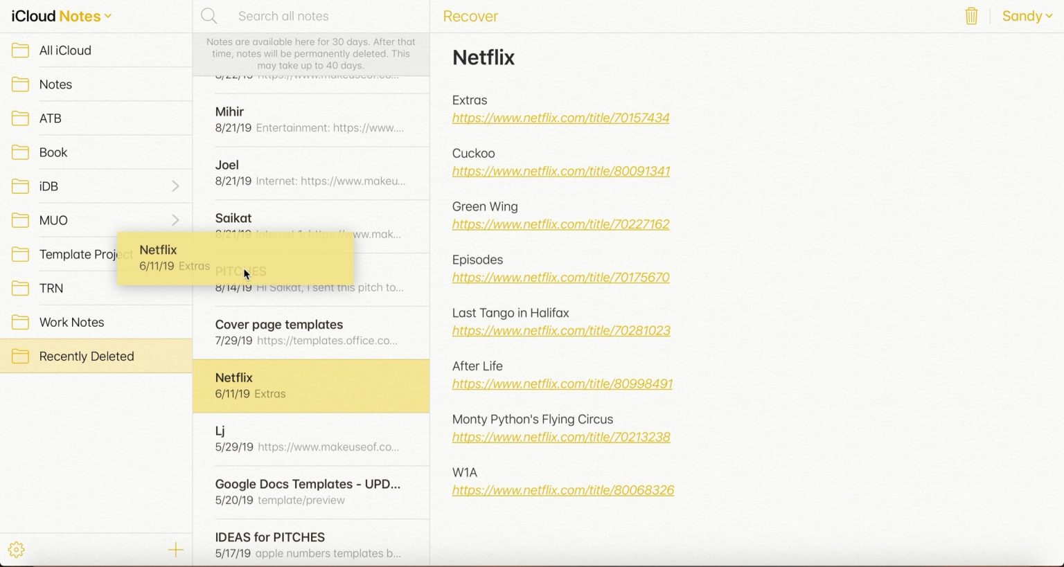 - در سمت چپ در زیر icloud Notes گزینهی Recently Deleted را انتخاب کنید.