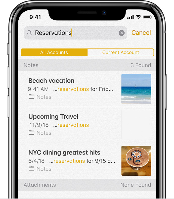 برنامه Notes را باز کنید. سپس روی آیکون پیکان ضربه بزنید تا لیست یادداشتها را ببینید. بعد ازآن روی نوار جستجو رفته یک کلمه یا عبارت یا عنوان از یادداشت مورد نظرتان را وارد کنید. گزینهی search تمام فایلهای موجود در کاربری های شما مانند ایمیل را چک میکند.