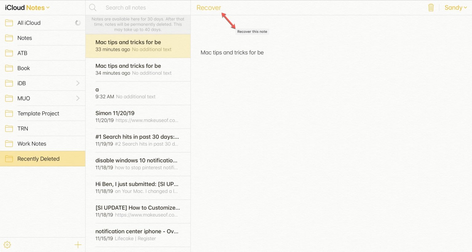 - سپس یادداشتی که میخواهید آن را برگردانید انتخاب کرده و در بالا روی Recover کلیک کنید.