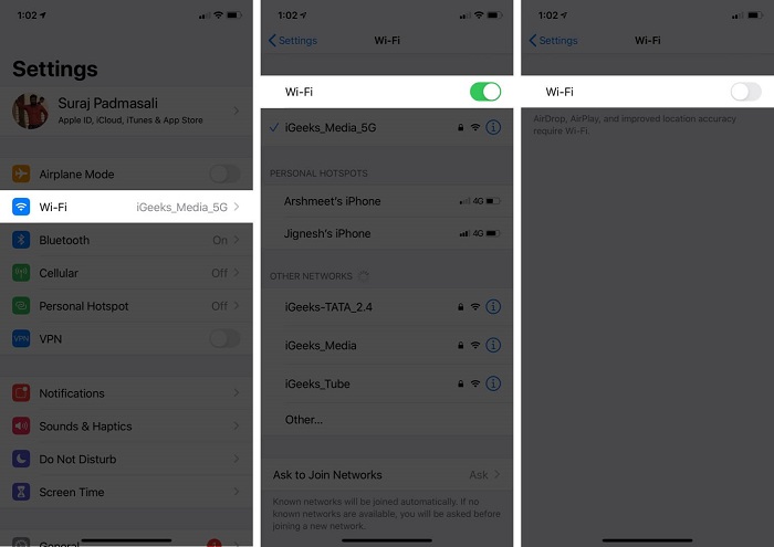 - Wi-Fi و Cellular Data را از قسمت Control Center خاموش کنید. یا می توانید Settings دستگاه را باز کنید و از آنجا Wi-Fi را پیدا و آن را غیرفعال کنید؛
