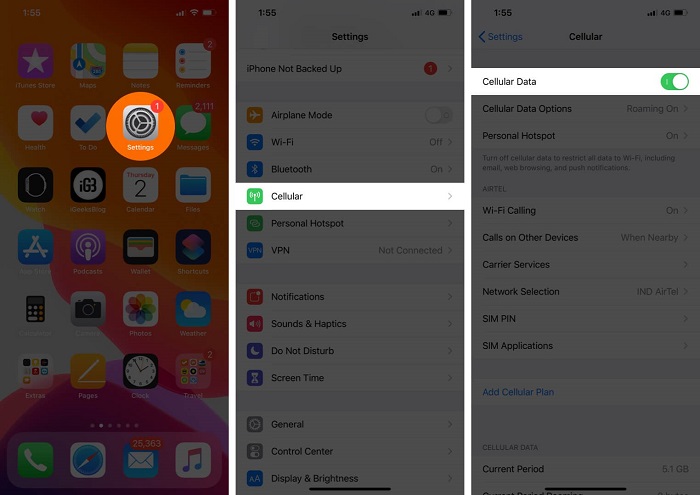 3. حالا دوباره در Settings به بخش Cellular بروید. Cellular Data را روشن کنید؛