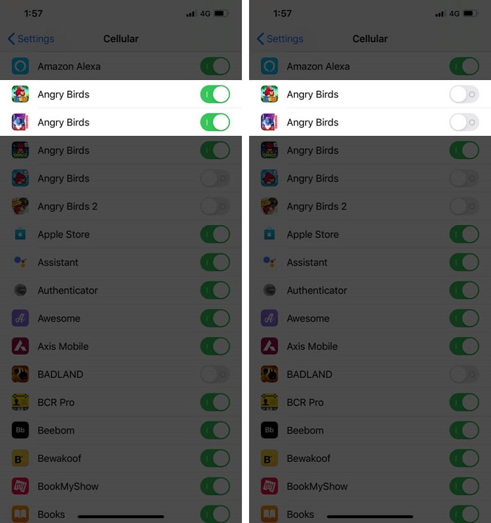 4. صفحه را به پایین بکشید و اپلیکیشن یا بازی مورد نظر خود را در زیر بخش CELLULAR DATA پیدا کنید. حالا تیک سبز آن را بردارید؛