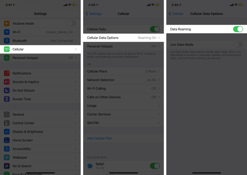 برای فعال‌سازی این گزینه ابتدا به Settings، سپس به Cellular، و در نهایت به Cellular Data Options بروید و قابلیت Data Roaming را فعال کنید.