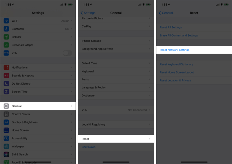 برای این کار ابتدا به Settings، به General، سپس به Reset و در نهایت Reset Network Settings بروید. حالا رمز عبور خود را وارد کنید و گزینه Reset Network Settings را لمس کنید.