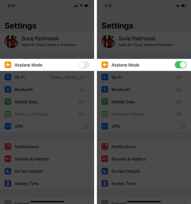 ابتدا اطمینان حاصل کنید که حالت پرواز (Airplane Mode) روشن نیست. حالا حالت پرواز را روشن و مجددا خاموش کنید.