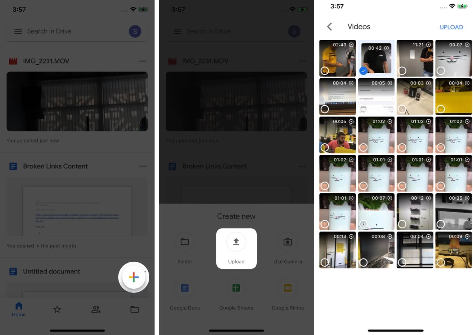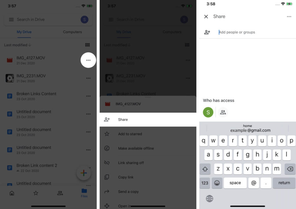 نکته: اگر قصد دارید فایل خود را برای شخص دیگری با اکانت متفاوت ارسال کنید، بر روی آیکن More (سه نقطه) واقع در کنار فایل ویدیویی موجود در iPhone Google Drive app کلیک کنید. سپس گزینه Share را انتخاب کنید و آدرس جیمیل شخص مورد نظر را وارد کنید و یا این که بر روی شخص مورد نظر در زیر Who has access ضربه بزنید.