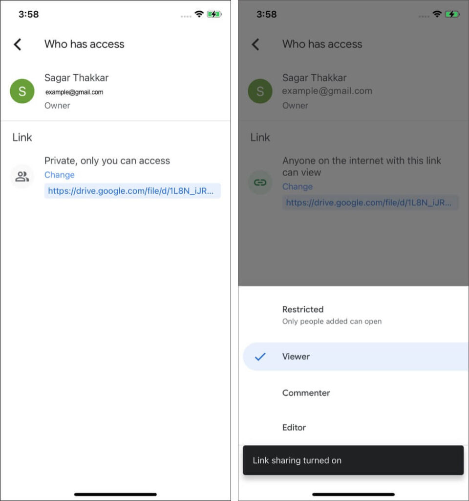 - در صفحه بعد بر روی Change کلیک کنید و یکی از گزینههای موجود را انتخاب کنید. (به طور مثال، گزینه Viewer امکان به اشتراک گذاری لینک فایل را میدهد و گیرنده میتواند آن را دانلود کند.) در آخر، لینک مورد نظر را کپی کنید و آن را از طریق پیامرسان دلخواه مانند واتساپ، ایمیل، پیام و غیره برای شخص مورد نظر خود ارسال کنید.