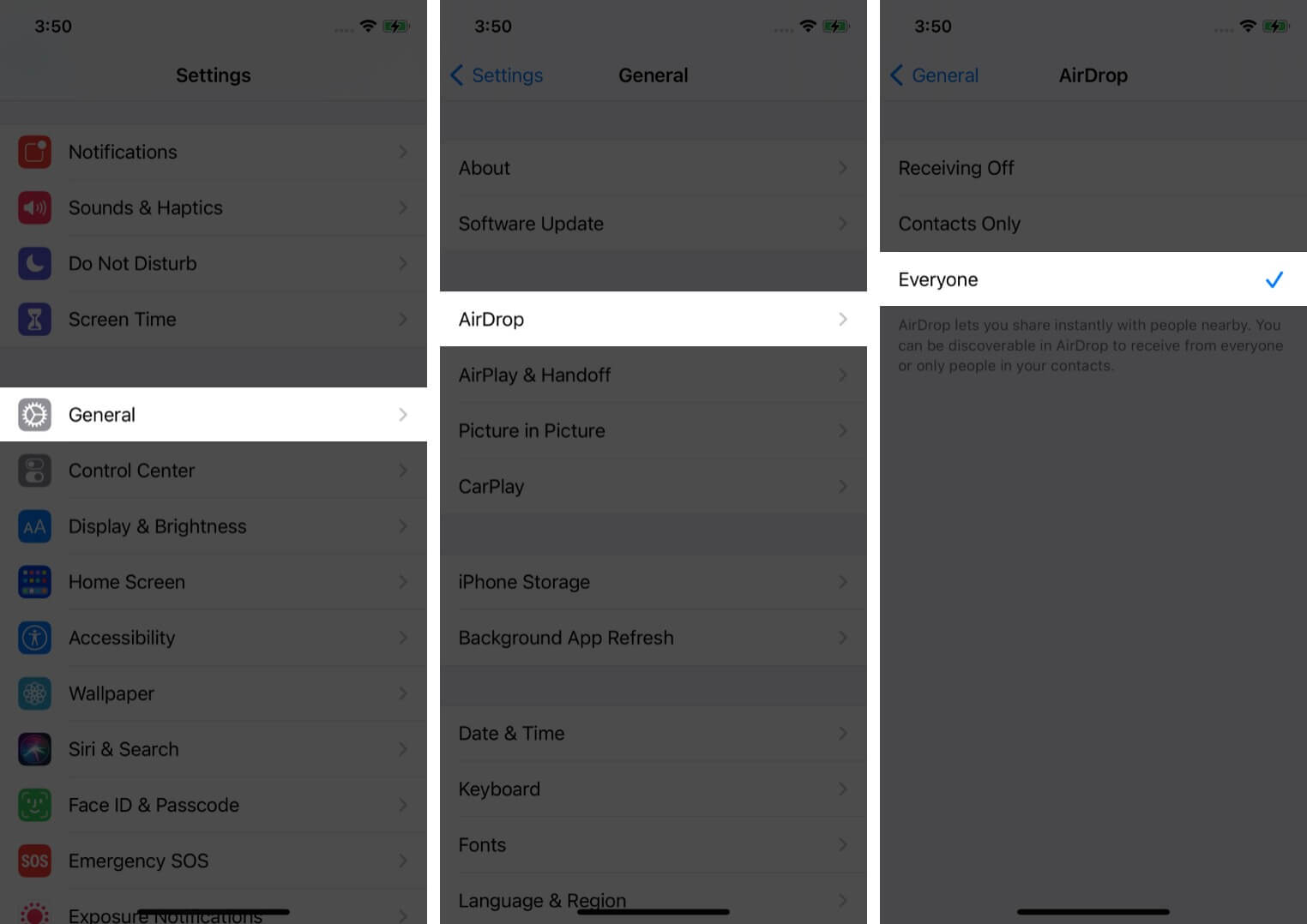 - در قدم اول باید از روشن بودن Air Drop مطمئن شوید و آن را بهگونهای تنظیم کرده باشید که بتواند فایلهای ورودی را دریافت کند. سپس بلوتوث و وای فای آن را در حالت فعال نگه دارید.
