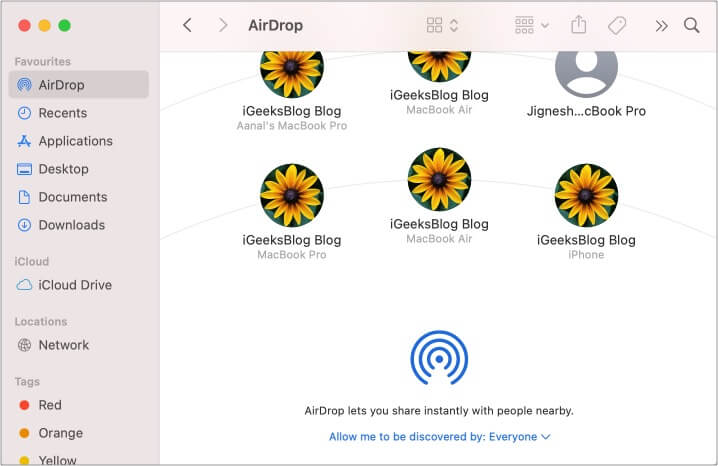 ابتدا Finder را باز کنید و سپس بر روی Air Drop کلیک کنید. در قسمت Allow me to be discovered by گزینه Everyone را انتخاب کنید.