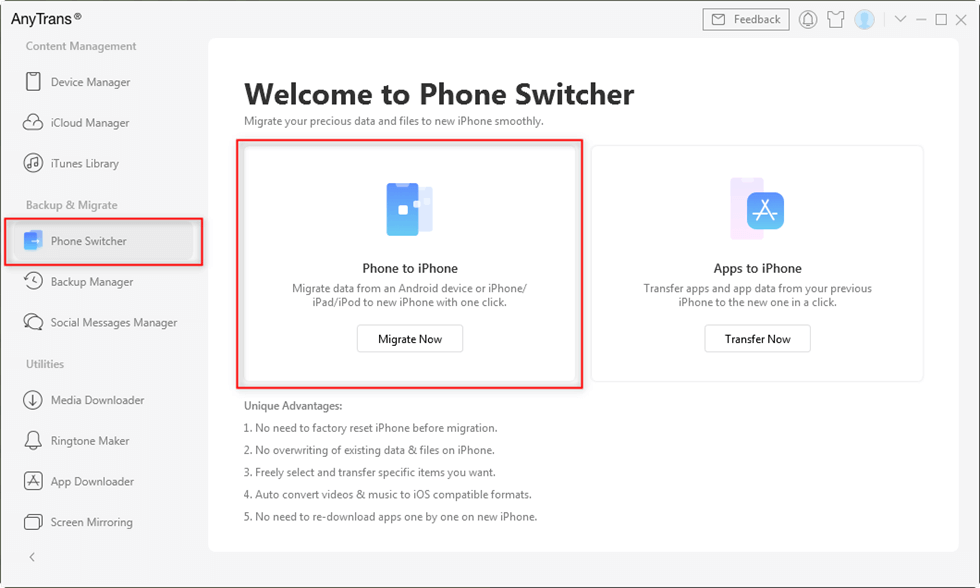 AnyTrans راه حلهای حرفهای را برای مدیریت اطلاعات آیفون شما ارائه میدهد. همچنین میتوانید از آن برای انتقال دادههای اندروید به آیفون استفاده کنید.