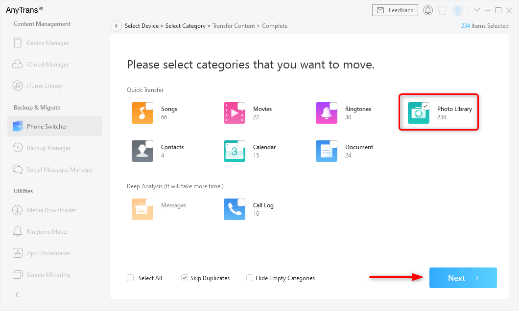 3- Photo Library را انتخاب و برای انتقال به آیفون روی Next کلیک کنید.