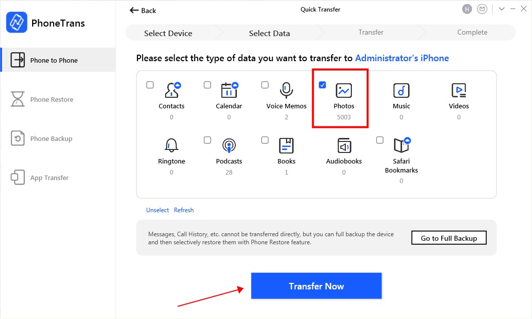 3-عکسها را انتخاب و برای شروع انتقال روی Transfer Now کلیک کنید.