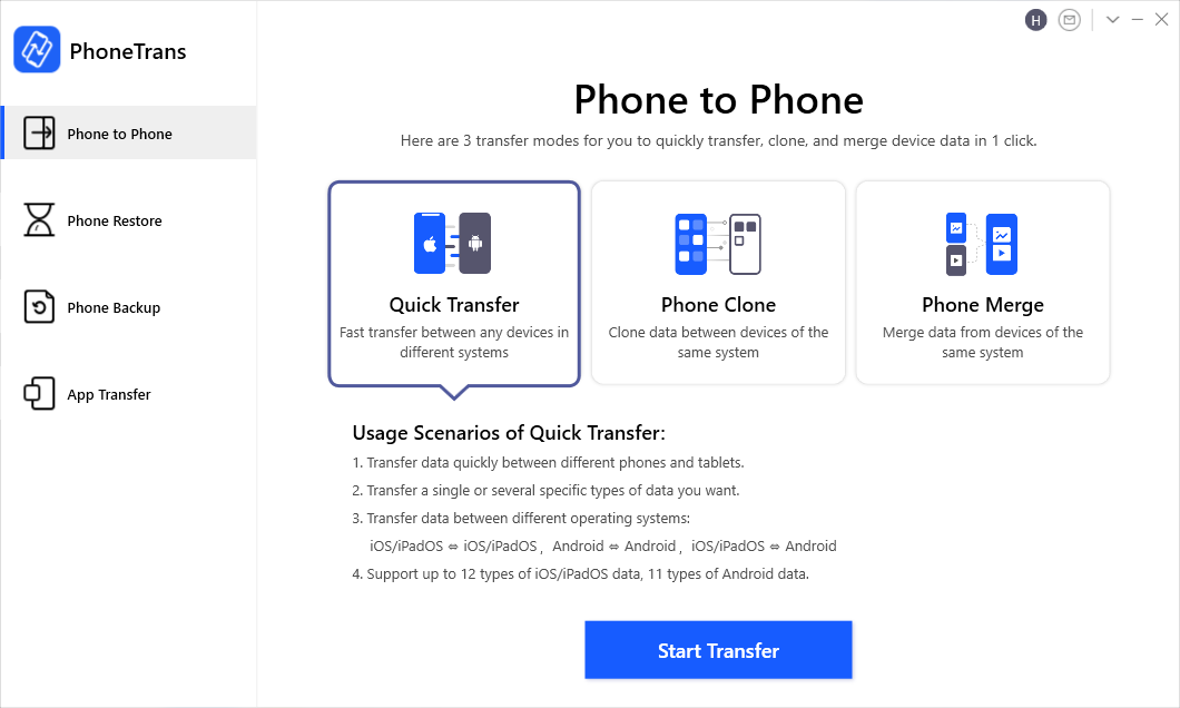 1-برنامهی PhoneTrans را در کامپیوتر خود دانلود و اجرا کنید. با اندروید و آیفون خود متصل شوید. Phone to Phone و سپس Quick Transfer را انتخاب کنید.