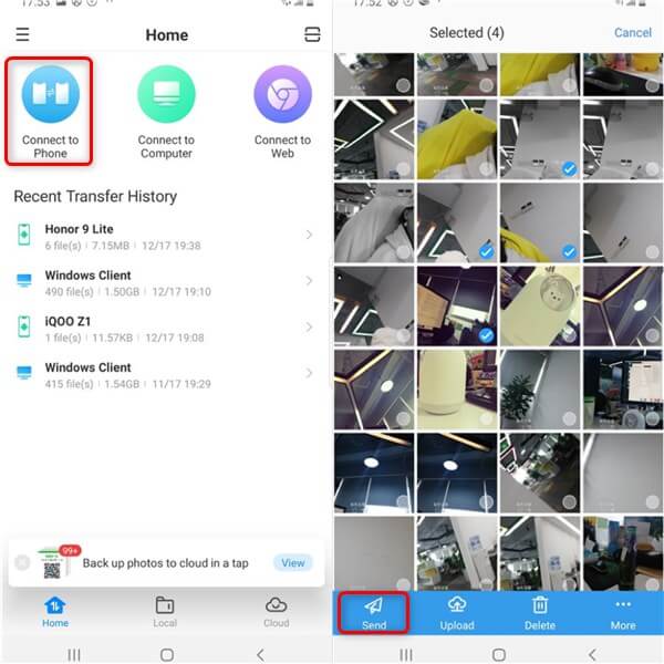 5-در دستگاه اندروید خود روی Local، Photos و Select the photos ضربه بزنید و عکسهایی را که میخواهید منتقل کنید انتخاب کنید و سپس Send را بزنید.