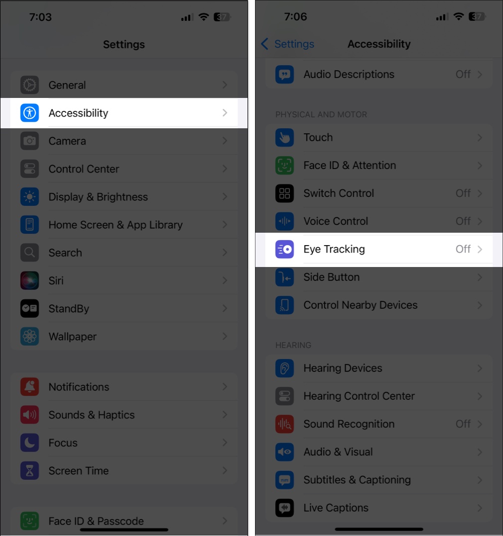 1- در آیفون یا آیپد خود به Settings بروید. به Accessibility رفته و روی Eye Tracking ضربه بزنید.