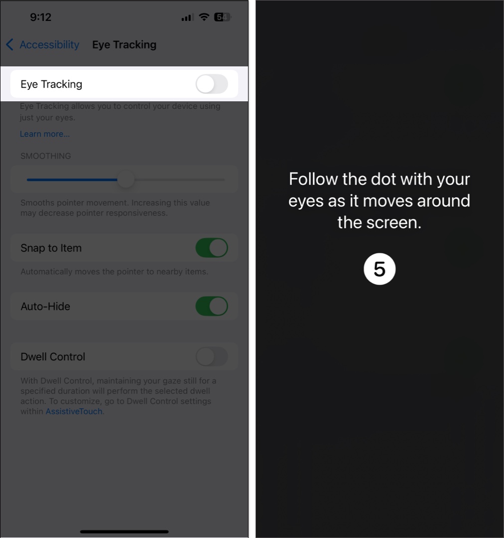 4- روشن کردن Eye Tracking در آیفون و آیپد، Dwell Control را نیز فعال میکند. Dwell Control یکی دیگر از ویژگیهای دسترسی است که توسط Eye Tracking برای کمک به انجام اقدامات مختلف بدون استفاده از لمس فیزیکی استفاده میشود.