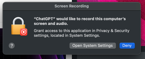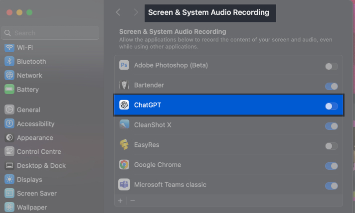 1. به صفحه تنظیمات Screen & System Audio Recording وارد می‌شوید. گزینه کنار ChatGPT را فعال کنید.