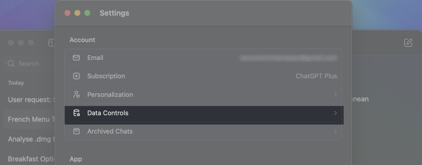 2. برای حذف تمامی چت‌های موجود در سابقه، در منوبار به ترتیب به ChatGPT و سپس Settings بروید. حالا روی Data Controls در قسمت Account settings کلیک کنید.