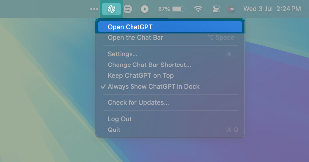 برنامه ChatGPT را به داک خود پین کنید. همچنین به جای آن می‌توانید روی آیکن چت جی پی تی در نوار منوی بالای صفحه کلیک کنید.