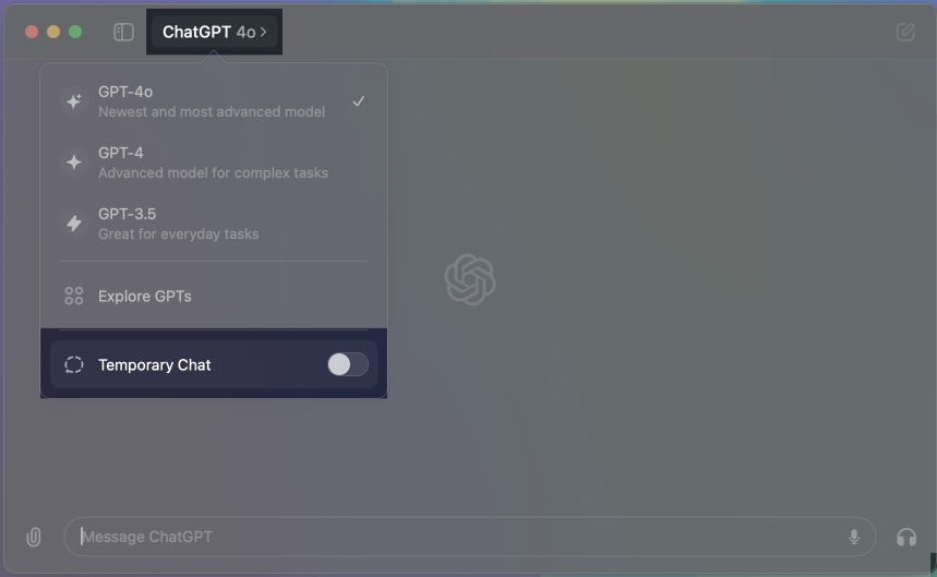 1. برنامه چت جی پی تی در مک را باز کنید و روی ChatGPT کلیک کنید. سپس، گزینه کنار Temporary Chat را فعال کنید.‌ (می‌توان از میانبر Shift + Command + N در کیبورد هم استفاده کرد.)