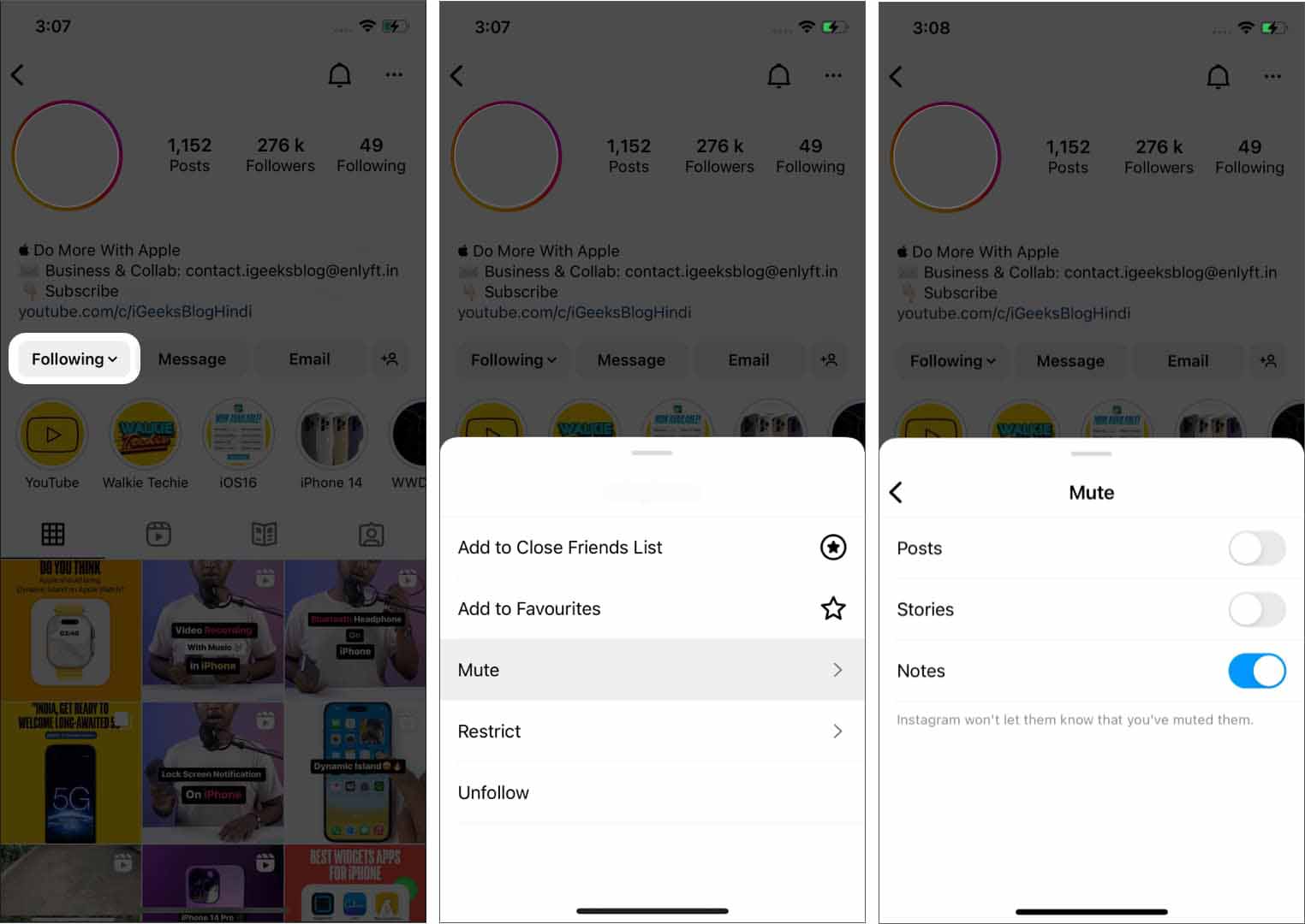 نکته: اگر قصد دارید مجدداً، یادداشتها را صدادار کنید، در پروفایل به قسمت mute بروید و آن را خاموش کنید. اکنون Unmute خواهد شد.