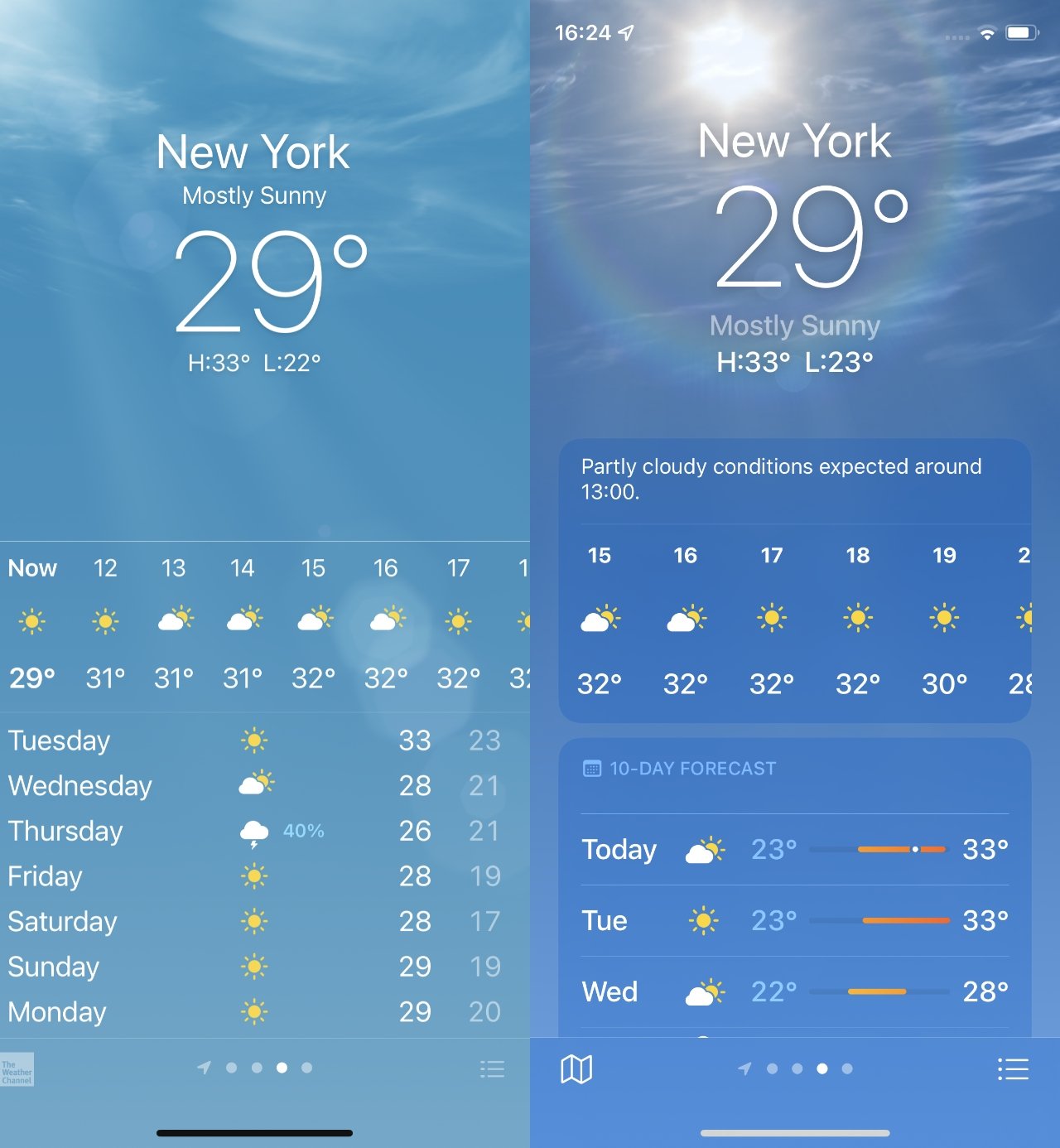 همانطور که میدانید برنامهی Weather اپل هیچ وقت یک برنامهی ضعیف و بد نبوده، نکته اینجا است که این یک برنامهی پایه و اصلی است. Weather به اندازهای پایه و اساسی است که نه تنها میلیونها نفر در سراسر دنیا از آن استفاده میکنند، بلکه الگو و پایهی بسیاری از برنامههای شخص ثالث نیز به حساب میآید.