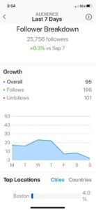 در این قسمت می‌توانید ببینید در هفته‌ی گذشته چند دنبال کننده به شما اضافه و کم شده است. همچنین مدت زمان میانگینی که فالورهای شما از اینستاگرام استفاده می‌کنند، قابل مشاهده است؛ این داده‌ها‌ برای تحلیل و آنالیز زمان پست‌ گذشتن با اینستاگرام Insights بسیار کاربردی است.