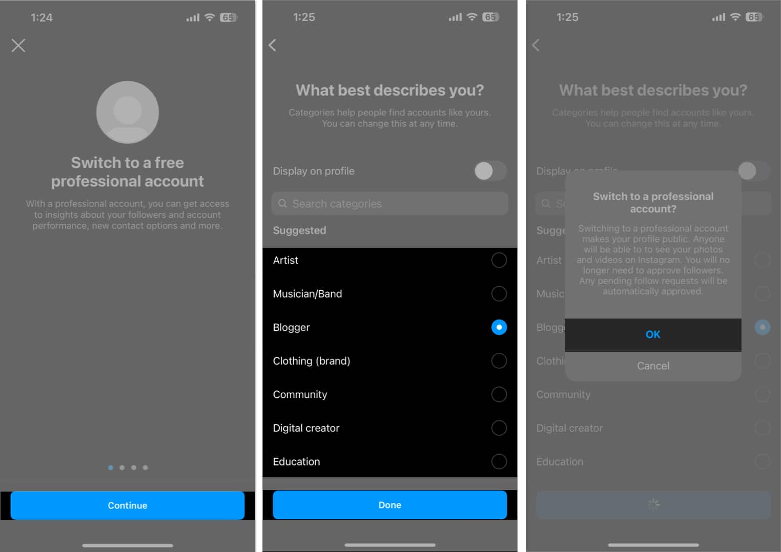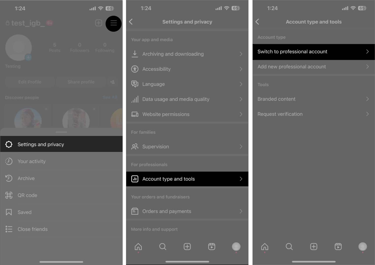 - اکنون بر روی گزینه Switch to professional account ضربه بزنید.
