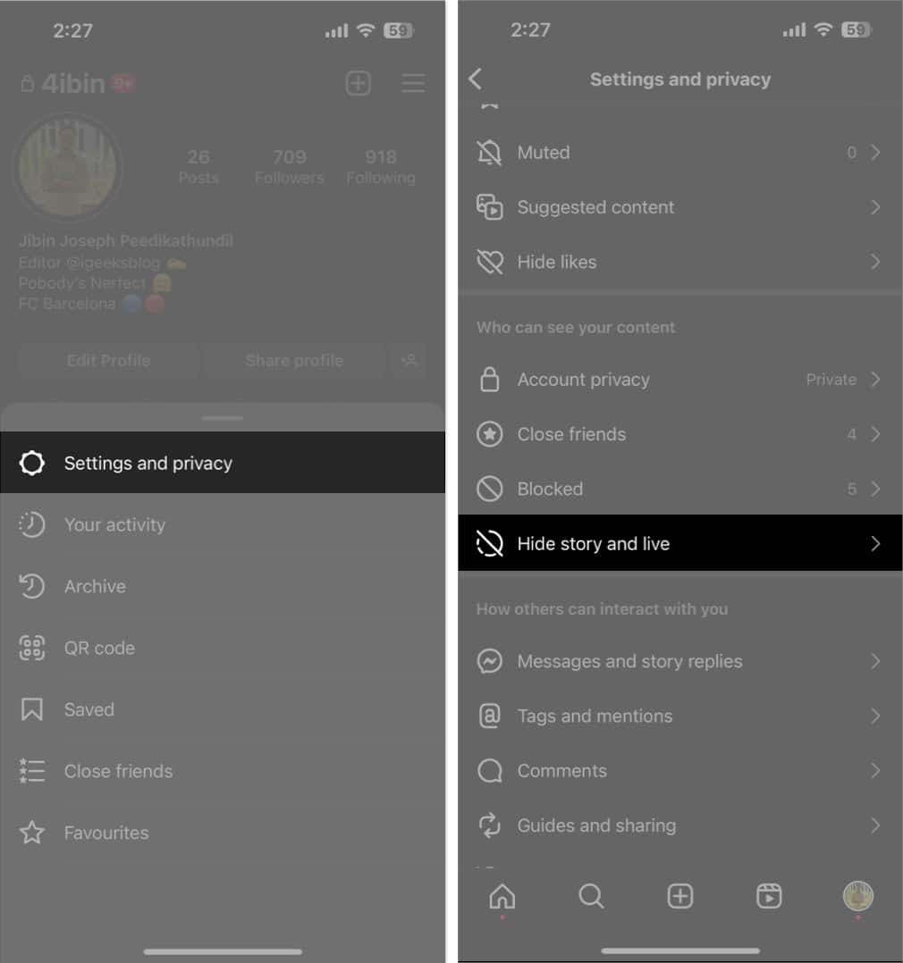 - بر روی گزینه Hide story and live ضربه بزنید.