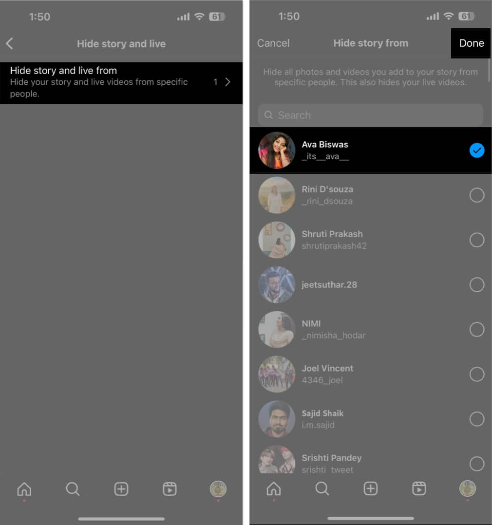 - پس از انتخاب اسامی افراد غیر مجاز به بازدید هایلایت شما، بر روی Done کلیک کنید.