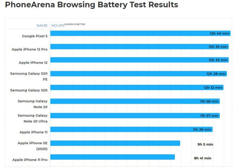 نتایج به دست آمده در بالا نشان میدهد آیفون ۱۲ پرو در وبگردی میتواند عملکرد بهتری نسبت به ۱۱ پرو داشته باشد. اختلاف شارژدهی به دست آمده توسط نسل جدید آیفون و آیفون پرو حاکی از اختلاف نزدیک به ۴ ساعتی نسبت به نسل گذشته است. این نشان میدهد وبگردی با آیفونهای جدید اپل مصرف انرژی بسیار کمتری نسبت به گذشته دارد. اما این میزان شارژدهی در مقایسه با گوشیهای اندرویدی پرچمدار رقیب به قدری زیاد نیست که چشمگیر باشد. ناگفته نماند٬ گوشیسازان اندرویدی با باتریهای بسیار بزرگتری نسبت به آیفونها به این نتایج دست پیدا کردهاند.