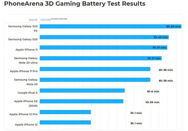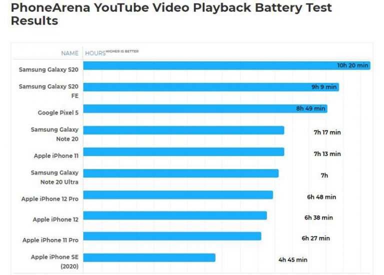 اما اوضاع در پخش ویدیو در یوتیوب متفاوت است. این نتایج به دست آمده نشان میدهند گوشیهای گلکسی اس ۲۰ و اس ۲۰ اف ای سامسونگ موفق به ۹ الی ۱۰ ساعت شارژدهی در همگام پخش بدون توقف ویدیو از یوتیوب شدهاند٬ در حالی که این میزان در آیفون ۱۲ پرو و ۱۲ کمتر از ۷ ساعت است. با این حال آیفونهای جدید نسبت به آیفون ۱۱ پرو سال گذشته٬ حدود ۲۰ دقیقه شارژدهی بیشتری در این بخش دارند. اگرچه در این آزمایش آیفون ۱۲ پرو بهتر از آیفون ۱۱ پرو سال گذشته ظاهر شده٬ اما آیفون ۱۱ نزدیک به ۱ ساعت بیشتر از آیفون ۱۲ شارژدهی را تجربه کرده است.
